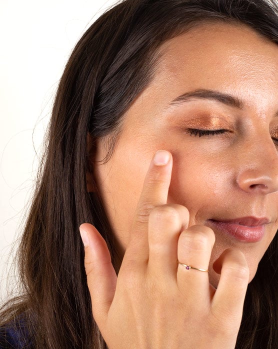 Apply to highlight areas - cheeks and nose - with fingertips or brush.