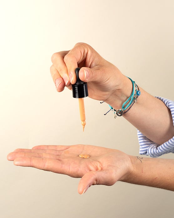 Pince la tétine de la pipette, insère-la dans le flacon, puis relâche pour prélever.